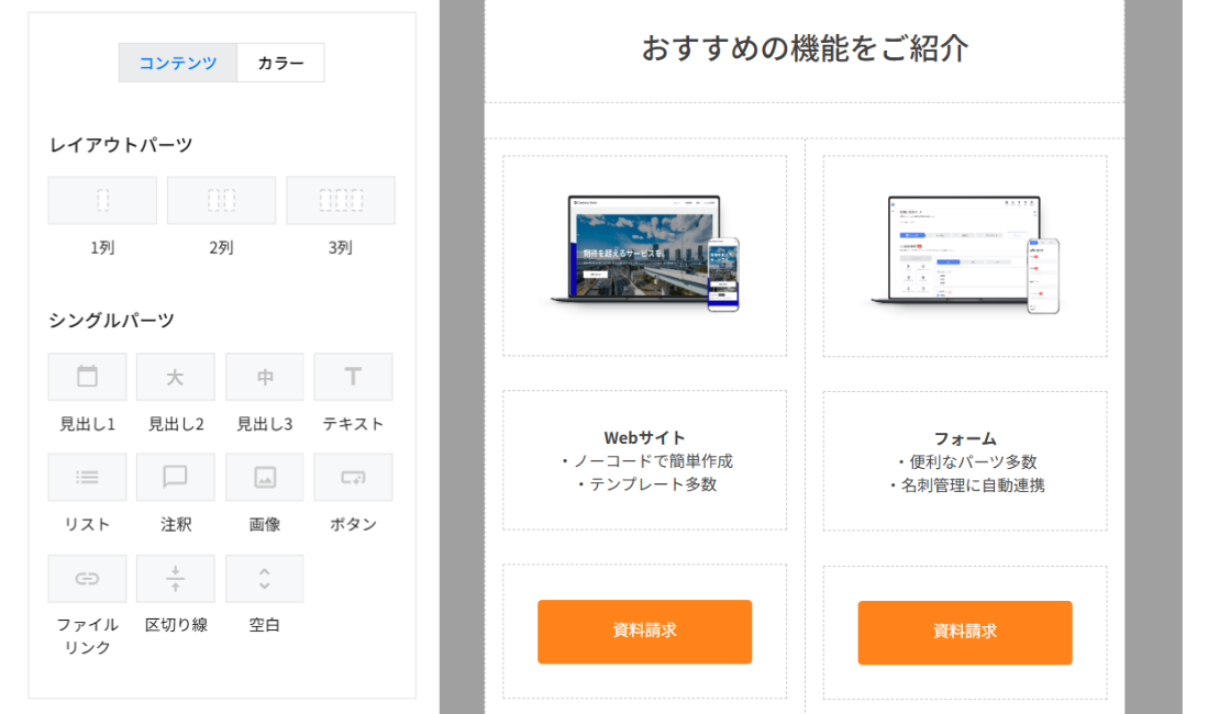 パーツをドラッグ&ドロップするだけで、ボタンの追加やレイアウト調整ができ、見栄えの良いメールが完成します。 また、目的別のテンプレートや、文章作成をサポートしてくれるAI機能が搭載されているので、作業時間をさらに短縮することが可能です。